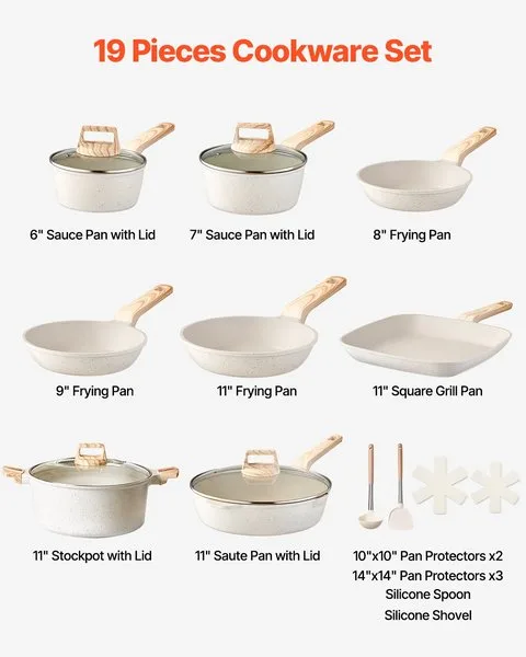 19-osaline kööginõude komplekt on praktiline ja mitmekülgne valik igasse kööki. Komplekti kuuluvad 15 cm kastmepott kaanega, 18 cm kastmepott kaanega, 20 cm praekastrull, 23 cm praekastrull, 28 cm praekastrull, 28 cm praadimisnõu kaanega, 28 cm potikaas, 28 cm ruudukujuline grillpann, 2 tk 25 × 25 cm pannivahed, 3 tk 35 × 35 cm pannivahed, silikoonlusikas ning silikoonist spaatel. See komplekt võimaldab mugavalt keeta, praadida, hautada ja grillida – kõik vajalik on ühes terviklikus lahenduses.