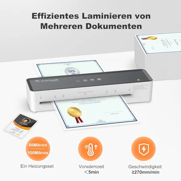 Kiire ja tõhus lamineerimine – kuumeneb töövalmis vähem kui 5 minutiga, lamineerimiskiirus kuni 270 mm/min, mis tõstab töö efektiivsust.