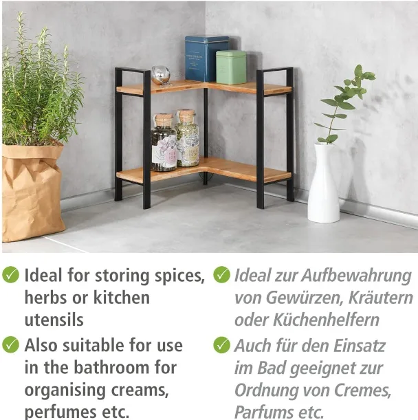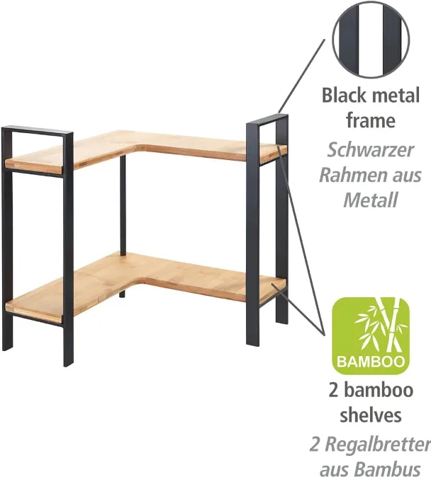 1 × Wenko Lou kööginurgariiul, kaks bambusest riiuliplaati, mustast metallist raam. Mõõdud (L × K × S): 30 × 33 × 30 cm, riiulite sügavus 11 cm.