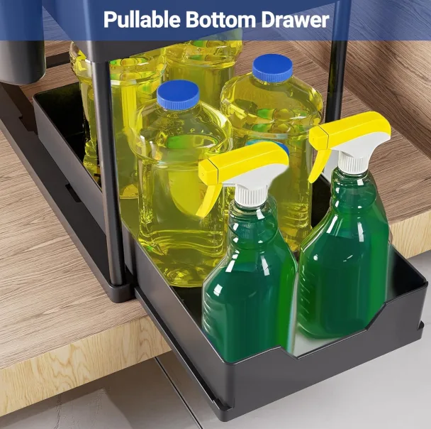Tõmmatav alumine sahtel võimaldab hõlpsalt kätte saada ka taga olevad esemed – enam pole vaja ebamugavalt kummarduda. Kahekordsed korvid on õhulise disainiga, tagades hea äravoolu ja vältides vee kogunemist.