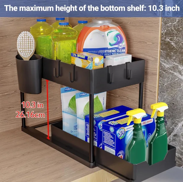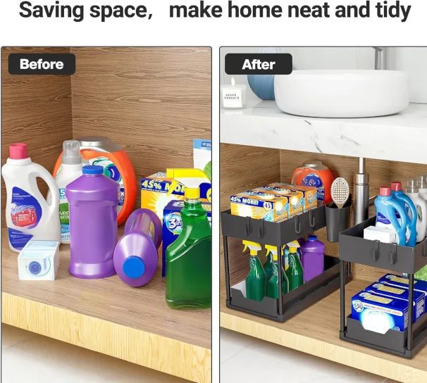Kahekorruseline riiul aitab hoida valamualuse pinna korras ja organiseeritud. Sobib ideaalselt nii kööki kui vannituppa – pesuvahendite, lappide ja tarvikute jaoks või šampoonide, dušigeelide ja kosmeetika hoiustamiseks.