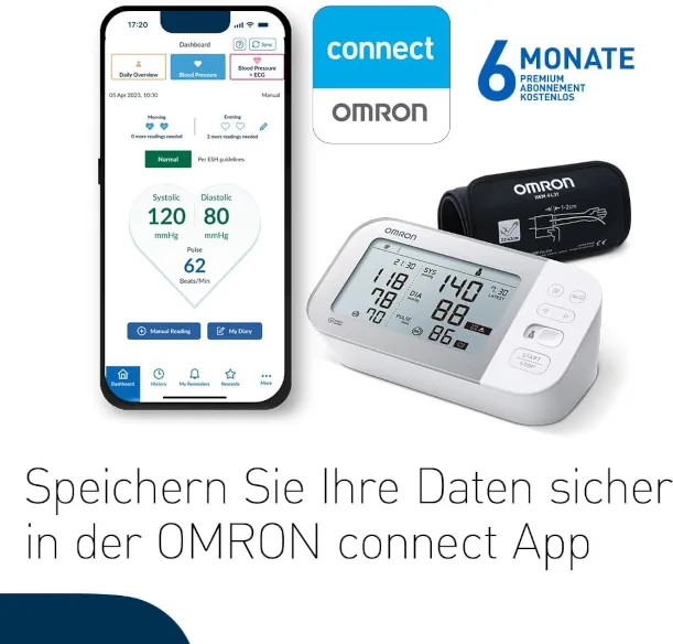 Tulemuste vaatamine ja salvestamine: mõõtetulemusi saab võrrelda varasematega kahekordsel ekraanil või edastada need automaatselt Bluetoothi kaudu Omron Connect rakendusse nutitelefonis – lisaks 6 kuud tasuta juurdepääsu premium-funktsioonidele.