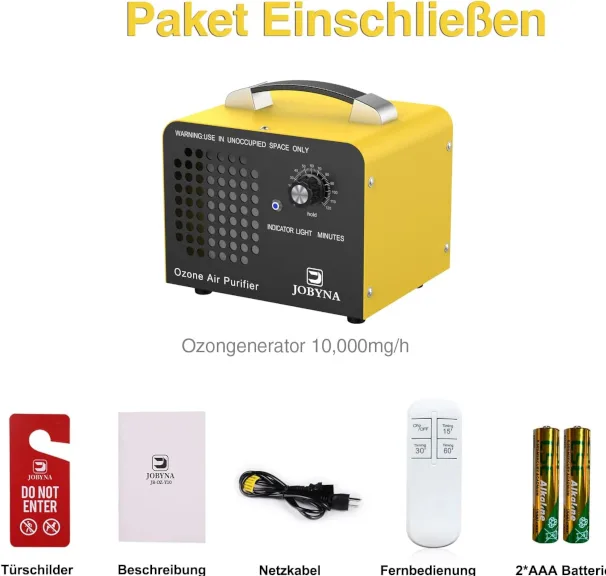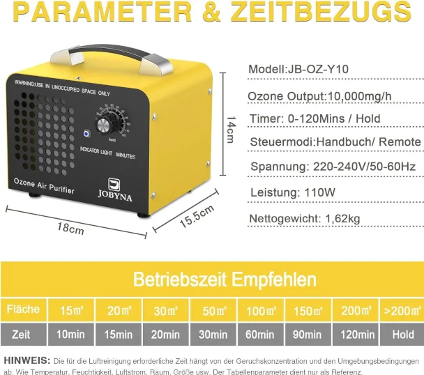 Tõhus osooni tootmine koos puldiga: seade toodab kuni 10 000 mg osooni tunnis, kasutades kaasaegset mobiilitehnoloogiat. Võrreldes väiksema võimsusega mudelitega on selle mõju palju tugevam. Masinat saab mugavalt puldist välja lülitada, ilma et peaks ruumi sisenema.