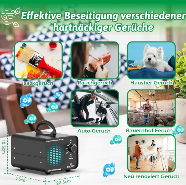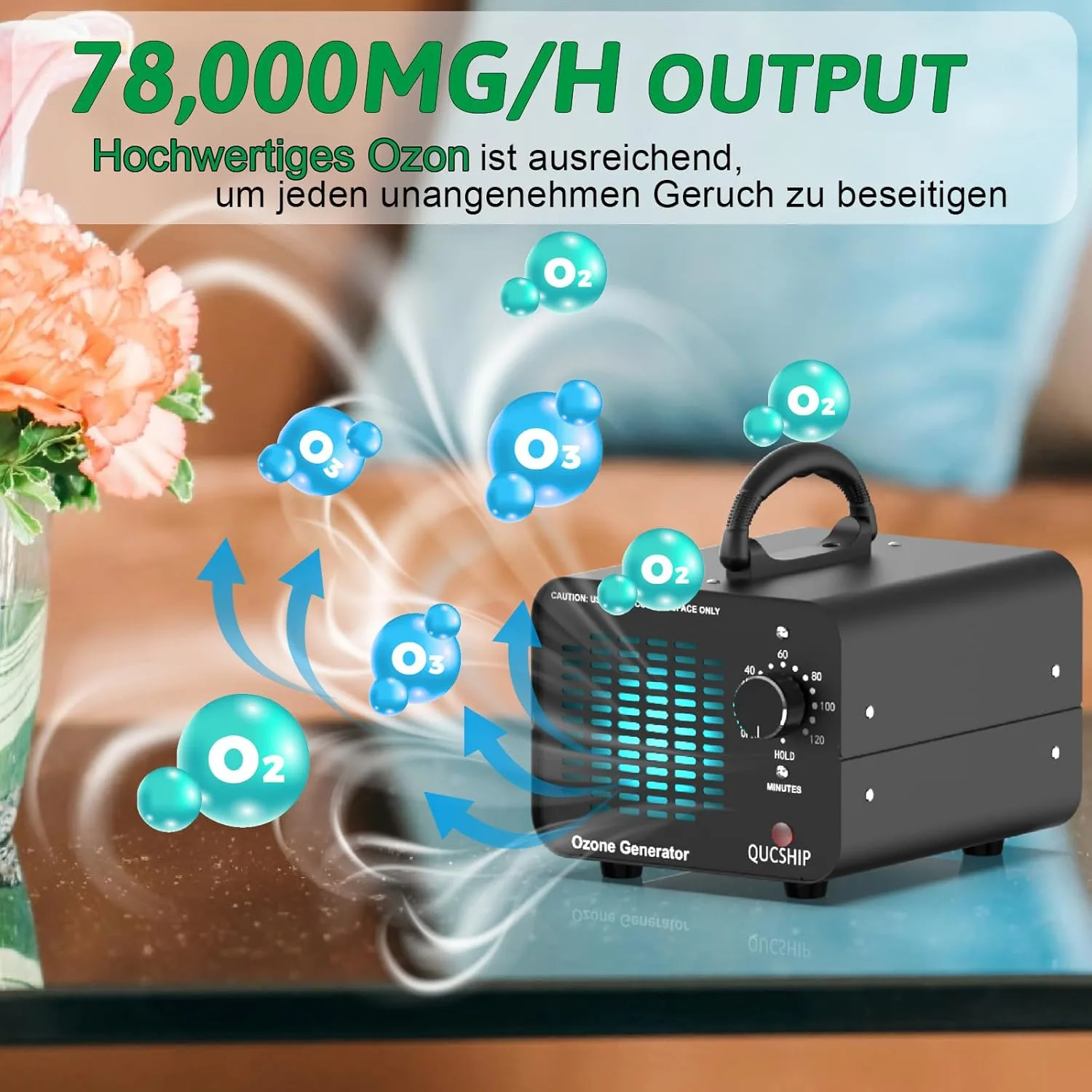 Tõhus osoonigeneraator: Qucship seade toodab kuni 78 000 mg/h osooni. Võimas sisseehitatud ventilaator jaotab osooni kiiresti ruumis, kus see reageerib kahjulike ainetega ning muudab need värskeks hapnikuks.