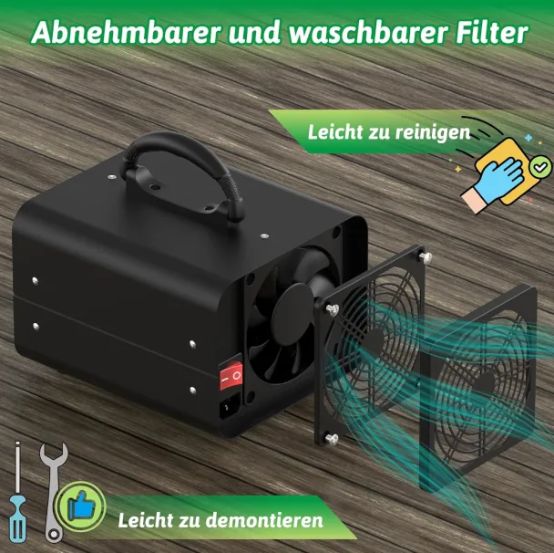 Kiire lõhnade eemaldamine: suure tootlikkusega (78 000 mg/h) osoonigeneraator kõrvaldab kiiresti mitmesugused ebameeldivad lõhnad. Osooni kasutamine õhu puhastamiseks on otsene ja tõhus meetod, mis toetab tervist, mugavust ja parandab elukvaliteeti.