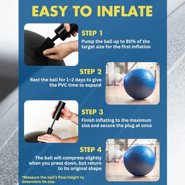 Komplektis treeningjuhised, pump ja tarvikud – Pall täitub minutitega tänu kaasasolevale kiirpumbale. Sobib suurepäraselt reite, kõhulihaste treenimiseks või taastusraviharjutusteks füsioteraapias.